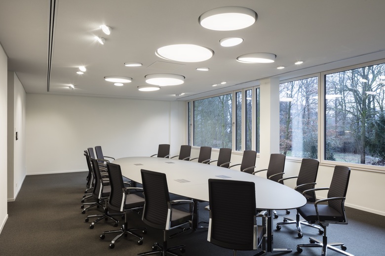Gleiches gilt für die Konferenzräume im Erdgeschoss des Seminargebäudes und im Staffelgeschoss. In letzterem verbergen sich der große Konferenzraum ebenso wie die Büros der Geschäftsführung hinter einer Wand aus weiß lasierter Tanne, welche gegenüber des zur Straße befindlichen Fensterbandes die gesamte Länge des Flures einnimmt. Neben der Allgemeinbeleuchtung finden sich in den Konferenzräumen auch Tweeter Einbaudownlights, welche die Holzwände aufhellen und die Struktur des Materials herausstellen.
