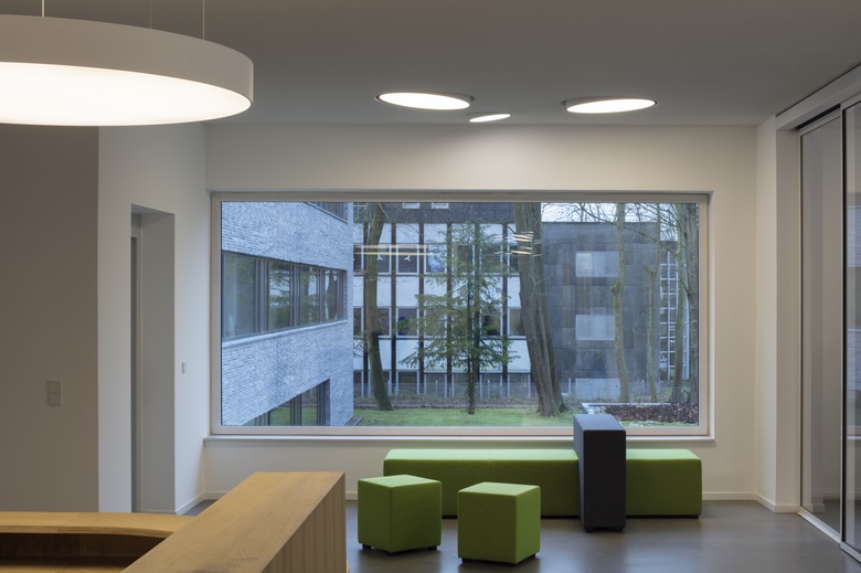 Beim Betreten des lichtdurchfluteten Foyers durch einen neu ausgebildeten Windfang spürt man gleich den Geist der neuen Schaltzentrale der 15.500 Mitglieder starken schleswig-holsteinischen Ärzteschaft. Der Innenausbau ist dezent, ruhig und klar. Vor weiß gespachtelten Wänden wirkt die abgerundete Rezeption aus warmem Holz besonders einladend. Sie wird von einer großen runden Supernova Pendelleuchte (Delta Light) atmosphärisch und blendfrei mit warm-weißem diffusem Licht erhellt. Eine zusätzliche Lichtabstrahlung nach oben hellt die Decke auf. Nach erledigter Anmeldung des Besuchers laden Sitzwürfel und eine Sitzbank, die mit ihrem Lindgrün einen farbigen Akzent bilden, zur Überbrückung der Wartezeit ein. Von dort schweift der Blick zurück in den geräumigen Windfang, der von Deckeneinbauvarianten desselben Leuchtentypus erhellt wird. Mit unterschiedlichen kleineren Durchmessern zu einer Gruppe konfiguriert und in verschiedene Richtungen geneigt, haben die Leuchten eine äußerst fröhliche Anmutung. Eine Wand des Windfangs wird zusätzlich von eleganten weißen Deckeneinbaustrahlern der Produktfamilie Tweeter mit ebenfalls neigbarem Leuchtenkopf beleuchtet.