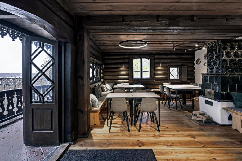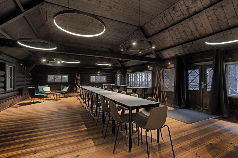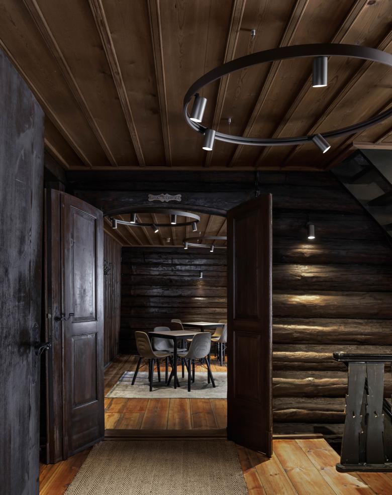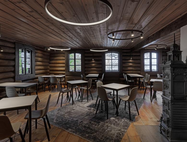 Nach einer behutsamen Renovierung durch Playze Architekten erscheint das denkmalgeschützte zweigeschossige Blockhaus in besserem Licht als je zuvor. Große Superloop-Ringleuchten von Delta Light sind in spielerischer Anordnung von den Decken abgehängt und spenden eine anheimelnde Grundbeleuchtung. Manche von ihnen sind mit Spy-On-Strahlern bestückt, welche die Tische bei jedweder Positionierung flexibel ins rechte Licht rücken. An den Wänden sorgt derselbe Strahler-Typ für eine sanfte plastische und materialbetonende Beleuchtung der massiven Holzbohlen, aus denen das Haus 1819/20 gebaut wurde.
