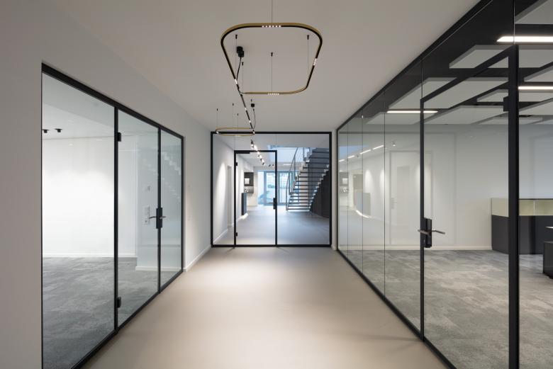 Ebenso zeitgemäß wie die neuen Räume zeigt sich das differenzierte Beleuchtungskonzept, das in der hauseigenen Lichtplanungsabteilung von Delta Light Deutschland entwickelt wurde und das gesamte Gebäu¬de in ein attraktives Hybrid aus Showroom und Arbeitsort ver-wandelt. Bereits in dem eleganten Foyer, das dank vergrößerter, trans¬parent gehaltener Türöffnungen resp. filigraner Glastrennwände Durchblicke in die Ellipse und in den Flur des Bürotrakts gewährt, fallen dem Besucher unterschiedlichste Leuchten ins Auge. Sie lassen die Verschmelzung von Arbeit und Präsentation sofort spürbar werden und machen neugierig darauf, die weiteren Räumlichkeiten und Beleuchtungslösungen zu erkunden.