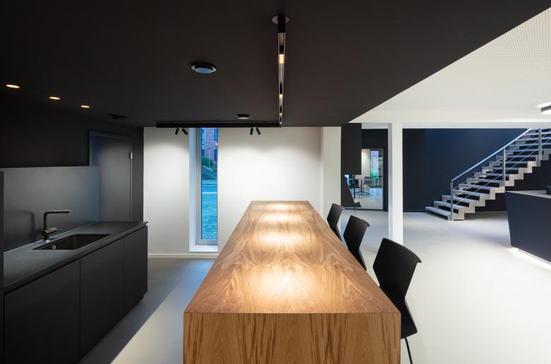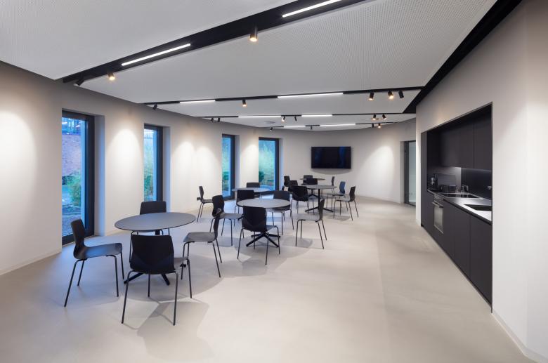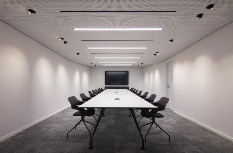 In dem heute multifunktional genutzten ehemaligen Präsentations¬raum sorgen nach Einziehen einer neuen Zwischendecke fugen¬bildend abgehängte weiße Akustikdecken-Segmente für Spannung und großzügiges Raumempfinden. Flächenbündig in die Fugen inte¬grierte Splitline-Profile verschmelzen mit der geschwärzten Rohdecke. Die an den Profilen montierten Lichtlinien und Spy-Strahler sind getrennt dimmbar und schaltbar und liefern somit immer das richtige Licht für unterschiedliche Anforderungen. Denn der Raum wird neben seiner Cafeteria-Funktion auch für Veranstaltungen, Schulungen und Produktvorstellungen genutzt, die verschiedene Lichtszenarien erfordern.