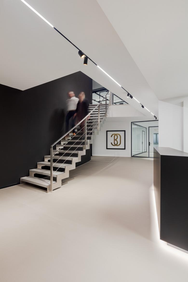 Dank Überarbeitung und Erweiterung der Eingangszone entstand ein großzügiger Empfangsbereich mit Stehtresen und zugeordnetem Coffee-Point für Gäste. Ein unterleuchtetes schwarzes skulpturales Empfangsmöbel, das sich dem eintretenden Besucher einladend zu-wendet, wird als zentrales Element des Foyers von drei Supernova-Deckenaufbauleuchten hervorgehoben. Deren zusätzlicher indirekter Lichtanteil legt sich als Aureole um jede Leuchte und hellt die weiße Akustikdecke auf. Nach diesem Blickfang schweift das Auge sofort zu dem markanten schwarzen Leuchtenprofil, das die Längsachse des Flurs raumstrukturierend durchschneidet und die transparenten, aber geschlossenen Arbeitsorte optisch an den öffentlichen Bereich anbin-det. Im Wechsel mit Lichtlinien für diffuses Licht nimmt das Shiftline-Profil justierbare Spy-Strahler für die Grundbeleuchtung und zur Aufhellung der Wände (Spy Focus) auf.