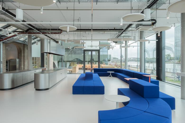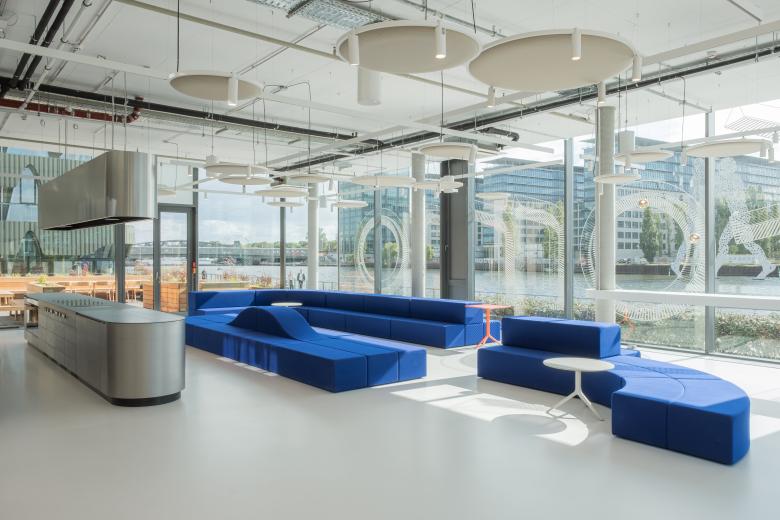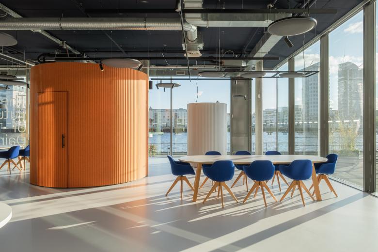 Für Soliscape mit seinen kreisrunden Elementen sprachen auch die große Flexibilität und die Schallabsorption, die in den hohen Räumen mit Rohdecken und großem Glasanteil enorm wichtig ist. Die Idee war in zwei Minuten präsentiert und ebenso schnell verstanden. Soliscape wurde in den Open Space-Büros und den halböffentlichen Räumen über seine eigentliche Funktion hinaus zum prägenden Designelement. Gleichzeitig dient das System als „Stimmungsmacher", da mit ihm unterschiedlichste Lichtatmosphären geschaffen werden können.