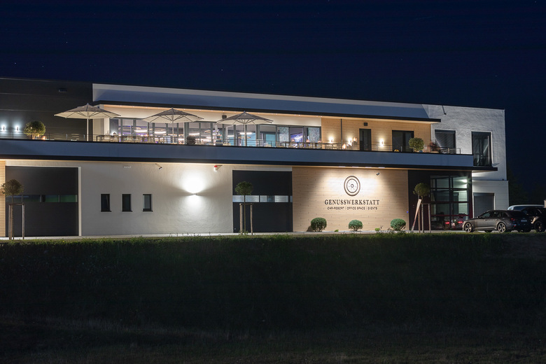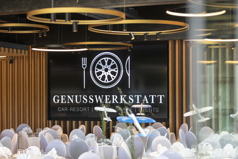 In der Genusswerkstatt in Haiger kommt das Auge gleich mehrfach auf seine Kosten. Denn dort wurde ein ungewöhnliches Konzept realisiert, das traumhaft schöne Automobile und eine Event-Location mit einem goldenen Himmel unter einem Dach vereint. Vierzig Superloop-Leuchten von Delta Light geben dem Saal eine festliche Atmosphäre.