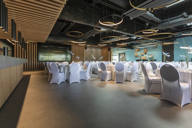 Eine 230 qm große möblierte Terrasse verleiht der im Obergeschoss gelegenen Location Penthouse-Charakter. Durch die gläsernen Fassadenelemente genießt der Gast selbst aus dem Innenraum einen traumhaften Ausblick ins Siegerland. Der Ausbau erfolgte mit hellen Holzlamellen als Wandelemente und als abgehängte Decke oberhalb des mit dem gleichen Holz verkleideten Tresens. In Türkis gehaltene Trockenbauwände schirmen die Sanitärbereiche von dem Saal ab. Die an der schwarz gestrichenen Decken-Stahlkonstruktion freiliegende Gebäudetechnik würde dem Raum zuviel Industriecharakter verleihen, hätte Lichtplaner Michael Segref von Lichtart Olpe nicht eine „Zwischendecke“ aus Leuchten hinzugefügt.
