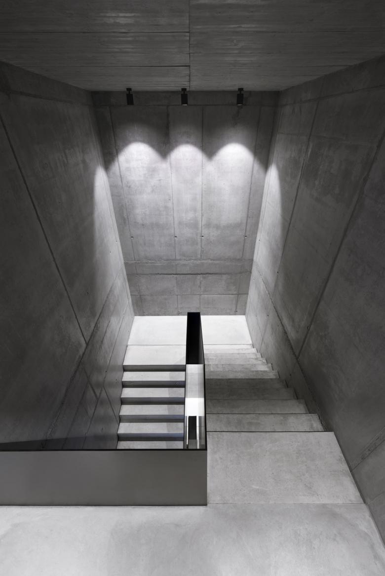 Das Gebäude, dessen Erdgeschoss in Augenhöhe mit dem Stadtbahnhof von einer Tiefgarage belegt ist, wird über einen Flur in Sichtbeton erschlossen. Ein Luftraum gewährt den Blick in die zwei Obergeschosse, deren Galerien mit in den Betonboden eingelassenen Glasscheiben gesichert sind. Sie werden ebenso wie die Podeste des Treppenaufgangs von schwarzen präzise ausrichtbaren Boxy-Deckenaufbau-Downlights erhellt. Im Luftraum selbst zieht eine von der Decke schwebende, mit Spy On-Strahlern bestückte Superloop-Ringleuchte alle Blicke auf sich. Die flexibel justierbaren Strahler hellen die Stirnwand des Flures und die Decke auf und betonen die Struktur und Kühle der Sichtbeton-Oberflächen.