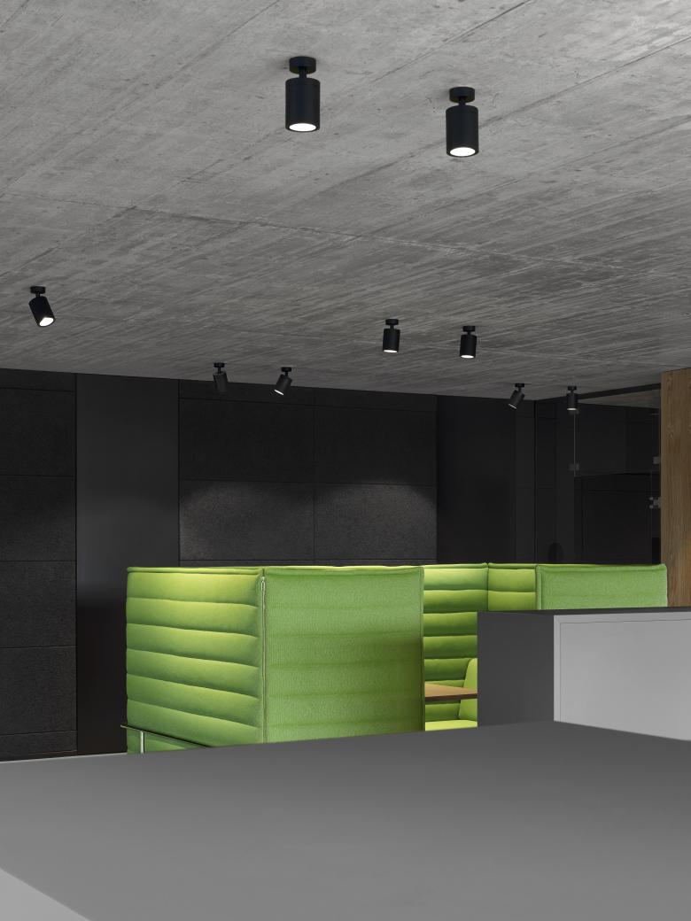 Das Büro empfängt Mitarbeiter und Besucher mit einem warmen Licht in differenzierten Beleuchtungsstärken. Die Arbeitsplätze werden mit direktem Licht aus abgependelten Profilleuchten erhellt. Wie im Flur erfolgt die Allgemeinbeleuchtung der Büroflächen mittels Boxy-Deckenaufbaustrahlern, die hier durch die Reflexion des Lichts am Boden ein umhüllendes Raumlicht spenden. Auf der Galerieebene kommt derselbe Leuchtentypus als Stromschienenstrahler-Strahler zum Einsatz. Dort wurden kurze Stromschienen-Segmente, die jeweils ein Downlight tragen, elegant zwischen den Holzlamellen der Innenraumverschalung montiert.
