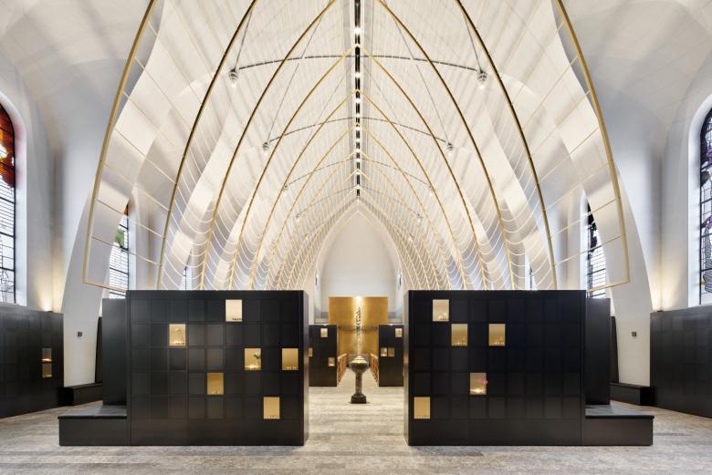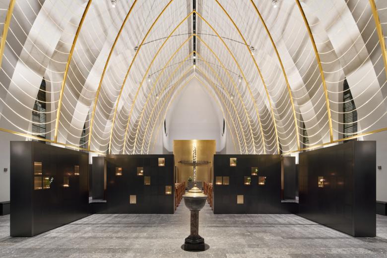 Die aus den Außenwandflächen in die Spitzbogenstruktur übergehende Raumkontur wurde durch behutsam eingefügte raumbildende Elemente nach innen versetzt und definiert so einen Kapellenraum mit 100 Sitzplätzen sowie ein Quadrum mit Taufbrunnen. Im Rhythmus der Kirchenjoche wird der neu ausgebildete Kapellenraum von einem Gefüge dunkler Urnenschränke begrenzt, auf denen die Lichtplaner von Delta Light ultraflache, direkt nach oben strahlende Gala XL-Deckenfluter positioniert haben. Sie hellen das dank der Transparenz der eingefügten Deckenskulptur weiterhin sichtbare Deckengewölbe äußerst dezent auf und illuminieren dabei gleichzeitig die Ketten. Die nicht sichtbare Position der Fluter, die sich über Augenhöhe befinden, lässt eine magische Lichtatmosphäre entstehen. Öffnungen zwischen den Stelen ermöglichen eine räumliche Verbindung der zentralen Kapelle mit den umgebenden Begräbnisstätten. Zwischen den Urnenwänden laden Sitzflächen zum Verweilen und Gedenken ein.