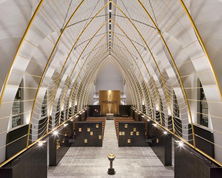Beim Betreten des einschiffigen Kirchengebäudes über die dunkel gestaltete Eingangshalle fällt der Blick sofort in die Mittelachse des achtjochigen Kirchenraums. Denn dort legt sich ein goldfarbener Schimmer über den Kapellenraum, der Neugier weckt und zum Fortschreiten anregt. Seit dem Umbau im Jahre 2022 durch das Büro Zweering Helmus Architektur + Consulting wird die Mittelachse des 1935 fertiggestellten expressionistischen achtachsigen Backsteinbaus von einer fragilen baldachinartigen Skulptur, deren schlanke Metallprofile der Spitzbogenstruktur folgend unterhalb des Kreuzgewölbes schweben, umfasst. Die dünnen Messingketten der Skulptur, welche die Metallprofile optisch in geschmeidigem Schwung verbinden, setzen in dem Raum ein buchstäbliches Highlight. Denn die Anstrahlung mit warmem LED-Licht lässt sie in sanftem stimmungsvollem Glanz erstrahlen. Die Skulptur inszeniert einen angenehmen wie auratischen Ort der Transzendenz und gliedert das Kirchenschiff in Kapelle und Kreuzweg.