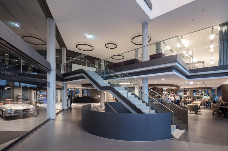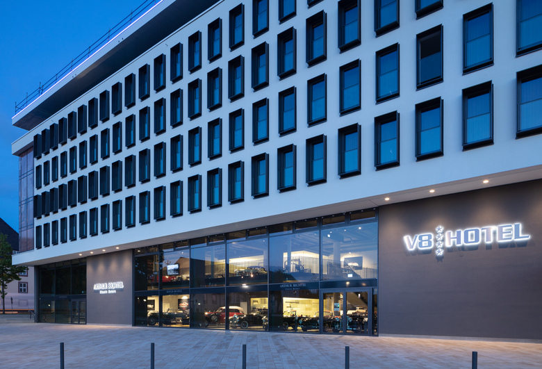 Neben den Zimmern, die sich mit raumhohen Fenstern hinter der klassischen Lochfassade über vier Etagen verteilen und von einem rundum verglasten Wellnessbereich mit auskragender, umlaufender Terrasse im sechsten Obergeschoss gekrönt werden, nimmt das V8 Hotel im ersten Obergeschoss einen großen Event- und Tagungsbereich auf. Im unteren Bereich des zweistöckigen Sockelgeschosses befinden sich Rezeption, Lobby, Bar und Restaurant, ein zweigeschossiger Showroom für die Oldtimer-Schätze von Arthur Bechtel Classic Motors, ein 400 qm großer McLaren Showroom sowie eine Werkstatt der Rennsport-Edelmarke. Das Sockelgeschoss wird von Pfosten-Riegel-Fassaden aus Stahl und Aluminium umhüllt, deren gläserne Scheiben Passanten Einblicke in die Ausstellungsbereiche und die offen gestalteten Hotelzonen gewähren. Leder, Cortenstahl und ein im Erdgeschoss durchgängig verlegter, extrem hart befahrbarer Bodenbelag, der für Parkhaussanierungen entwickelt wurde, sind Referenzen an die Welt des Automobils. Gleiches gilt für die kreisrunden Ringleuchten, die – groß wie Reifen – in Variationen an den Betondecken abgependelt sind.