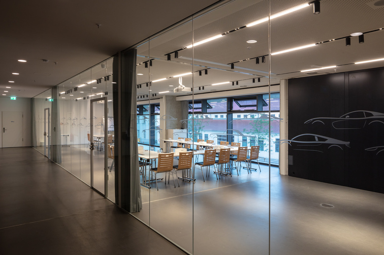 Der transparent mit Glastrennwänden abgeschirmte Tagungsbereich umfasst drei zusammenschaltbare Räume für jeweils 30 Personen. Mittels Splitline 51 Profilen wurde hier eine multifunktionale Beleuchtung umgesetzt, die bei einem einheitlichen Erscheinungsbild für das jeweils richtige Licht sorgt. Während in die Profile integrierte Spots und Microline-Lichtlinien bei Beamer-Präsentationen eine angenehme Grundbeleuchtung des Raumes erzeugen, dienen getrennt schaltbare Strahler der Produktfamilie Spy der normgerechten Beleuchtung der Konferenztische.