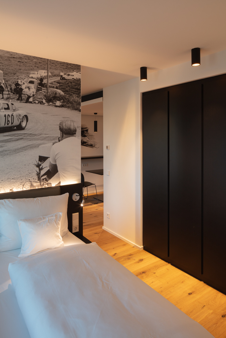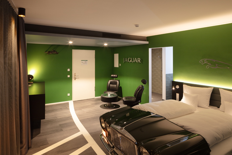 Zu wenige Zimmer standen im denkmalgeschützten Bestandshotel der vor neun Jahren eröffneten Motorworld Böblingen, die jährlich von etwa 600.000 Menschen besucht wird, zur Verfügung. Die Motorworld hat sich daher zum Bau eines weiteren V8 Hotels mit wesentlich mehr Kapazität entschlossen. Seit Anfang des Jahres können Hotelgäste in dem sechsgeschossigen 4 Sterne Superior Haus unter 16 Themenzimmern, 130 Business-Zimmern und sieben Longstay-Appartements wählen, mit wieviel automobilem Flair sie die Nacht verbringen möchten. Während sich die 22 qm großen Business-Zimmer und die doppelt so großen Appartements mit Kitchenette und Terrasse zurück¬haltend in klarem Design zeigen und ihre automobilen Verweise einzig aus Wandgrafiken und großformatigen Archivfotos aus dem Motorsport schöpfen, dreht sich die Gestaltung der Themenzimmer buchstäblich von Kopf bis Fuß um das Automobil. Denn die Fußenden der Betten sind teils mit der Motorhaube eines British Racing Jaguar, eines Forza Italia Alfa oder anderer Rennwagen geschmückt. Mit Glasscheiben belegte Reifen oder Felgen dienen als Nachttische und Wandmalereien dekorieren die Räume mit Darstellungen, die zum Zimmer-Thema passen oder sie legen Zeugnis ab von den großen Rennen und Rennfahrern dieser Welt.