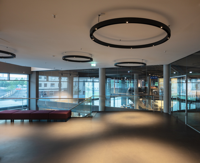 Im Haupteingangsbereich, der sich als verglaster Luftraum über alle Geschosse erstreckt, wird der Besucher von einer spielerischen Komposition aus Super-OH Leuchten in unterschiedlichen Durchmessern empfangen. In verschiedenen Höhen und Winkeln schweben sie unter der Decke des Abschlussgeschosses und tauchen das Entrée mit ihren nach unten leuchtenden Ringen in warmweißes Licht. Im Atrium, dessen Treppenanlage die Tiefgarage mit dem Erd- und dem ersten
