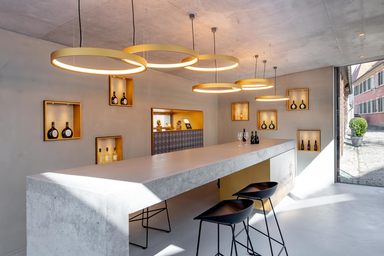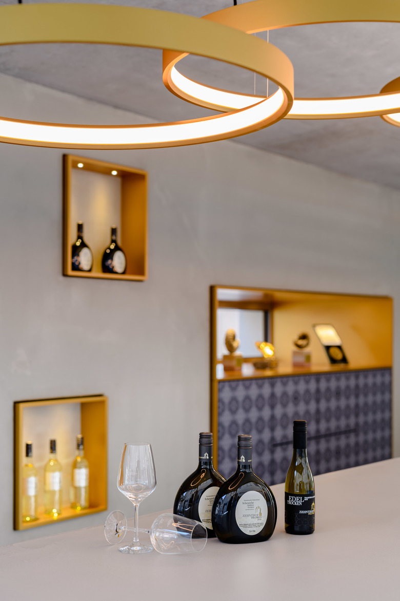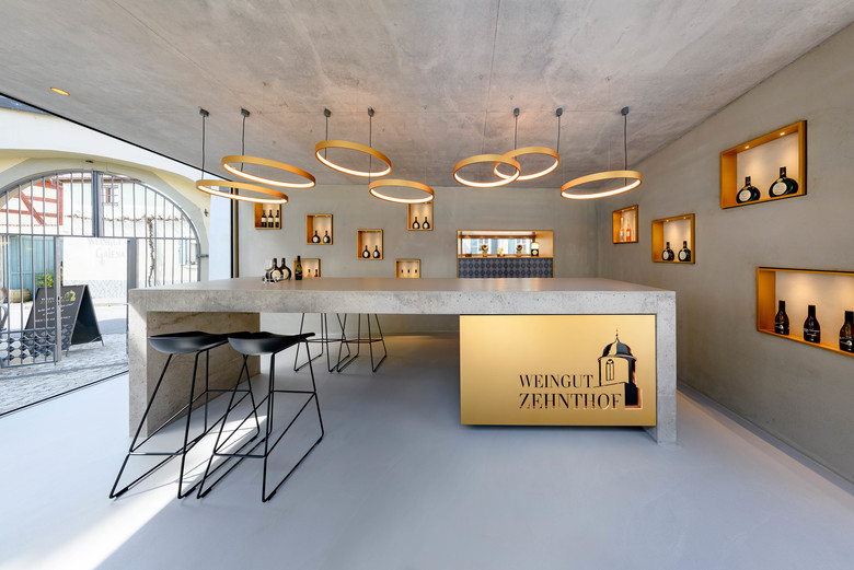 Auch in dem gut 30 Quadratmeter großen Innenraum setzten Bauherr und Architekt auf konsequente Zurückhaltung. Das Grau des Sichtbetons für Boden, rückwärtige Wand, Decke und Verkostungstheke wird nur von einer Schmuckfarbe durchbrochen. Das für die Edelstahlrahmen der in den Beton eingelassenen beleuchteten Nischen und für die grazilen Ringleuchten verwendete Gold soll an das Logo des Weinguts Zehnthof erinnern, bei dem es eine dominante Wirkung zeigt. Auch in der Vinothek hat das Gold die Funktion eines Eyecatchers.