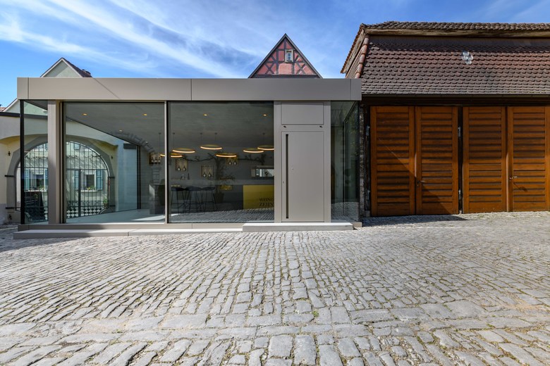 Andreas Ebner von Mayarchitekten entwarf ein Gebäude, das sich nicht nur von der bis noch vor wenigen Jahren üblichen, sondern auch von der zeitgenössischen Weinarchitektur mit ihren modern interpretierten Materialanspielungen an Attribute des Weinanbaus, des Kelterns oder Lagerns abhebt. Kein Holz, kein Muschelkalk ist hier zu sehen. Stattdessen erhebt sich auf dem Baugrund ein konsequent schlichter Sichtbetonkubus mit raumhoher, zum Hofensemble weisender Glasfassade, Übereckverglasung und leicht abgeschrägtem Dach. Die filigrane Glasfassade nimmt rechts die mit einem geschlossenen Paneel versehene Eingangstür sowie links eine Schiebetür auf, die an warmen Tagen geöffnet wird.