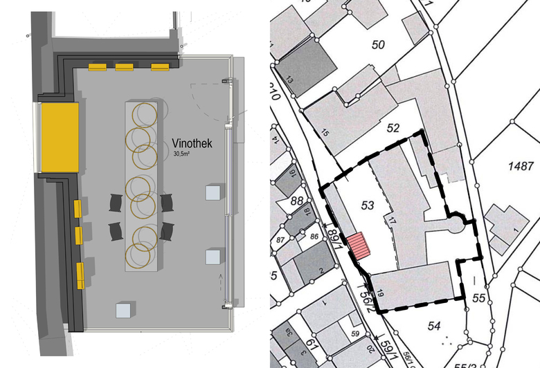 Der Neubau bildet zu der historischen, das Gut von der Hauptstraße abschirmenden Einfriedungsmauer wie auch zu dem mit Walmdach begrenzten, ebenfalls historischen Nebengebäude jeweils eine Schattenfuge. Gleich bei Betreten der Hofanlage durch das Rundtor fällt die Vinothek ins Auge, markiert so das Entrée und repräsentiert als Willkommensgruß den modernen Geist, von dem das Gut heute inspiriert ist. Somit schafft die Vinothek ein Spannungsfeld zu dem historischen Hof.