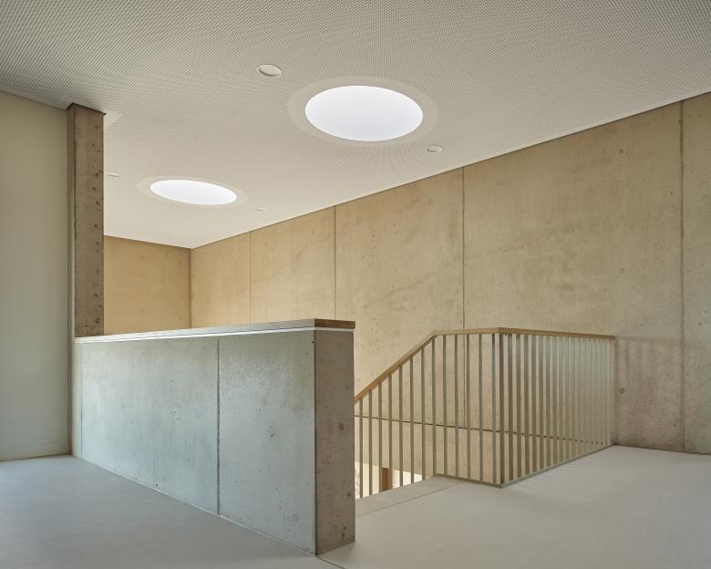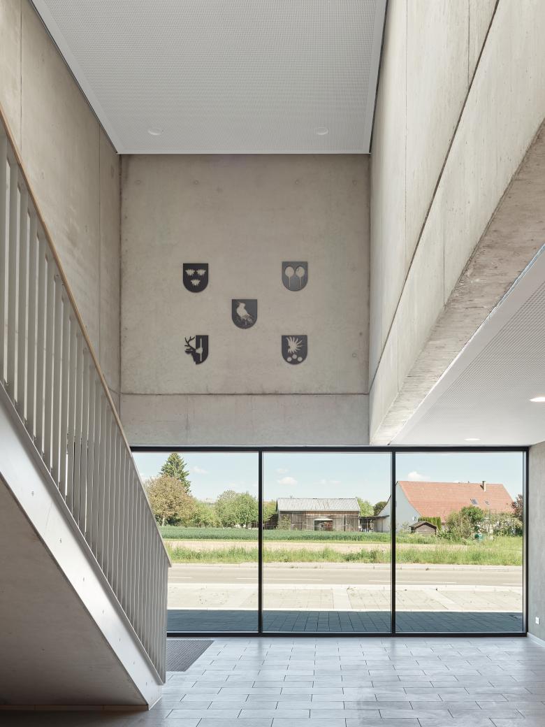 Die Organisation des Hauses folgt den betrieblichen Abläufen der Feuerwehr. Im Erdgeschoss befinden sich Alarmumkleiden, eine sechsstellige Fahrzeughalle, Werkstätten und eine Waschhalle – funktional gegliedert und über ein zentrales Foyer erschlossen. Dieses erschließt nicht nur alle Funktionsbereiche, sondern fungiert auch als Schnittstelle zwischen Einsatzbetrieb, Schulung und Verwaltung. Im Obergeschoss sind Schulungs-, Jugend- und Bereitschaftsbereiche sowie Büros untergebracht. Der Flur im Obergeschoss verbindet nicht nur Räume, sondern auch Menschen: Mit direktem Sichtkontakt zur Fahrzeughalle bleibt das Geschehen stets präsent.