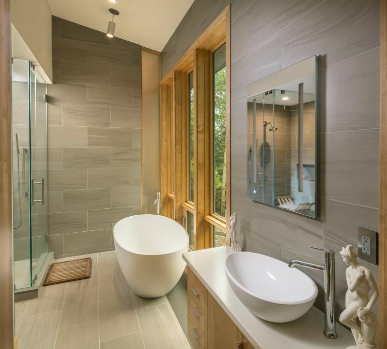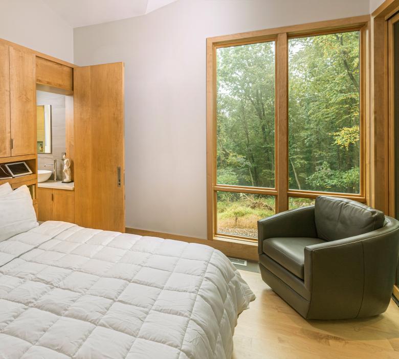Selah House, a small (2,247 SF) home for a soon-to-be-retired doctor, is designed with mature environmental strategies that, in its next life, will become part of a nature preserve. Great care was taken to locate the house in an existing clearing with a “light touch,” removing very few trees. Designed for a long 100-year life, all decisions regarding design, material, and systems were optimized for an environmentally engaged home. The program is simple – living, kitchen, bedroom, bath with two special spaces, a private garden, and a writer’s loft. The house is designed for the owner and visitors to the future nature preserve to be intimately connected to the cycles of the day, weather, and seasons, as well as the abundant local flora and fauna. Standing in the center of the living room you are only eight feet away from the courtyard to the north and the southern view through the trees and across the valley. In the master bed with the sliding glass doors open, the bedroom becomes a sleeping screen porch in the forest. From the writer’s tower, it seems as if you can touch the moon and stars, brilliant in the black sky.