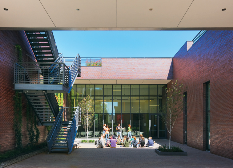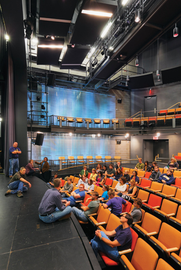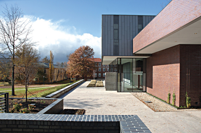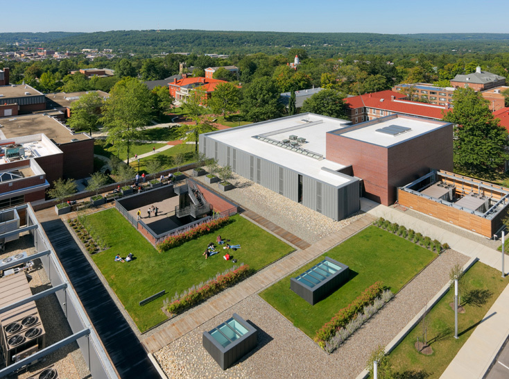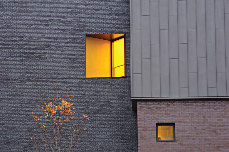 Conceived as a teaching theater for drama, television and related communication arts, the facility creates a dynamic new center of student activity on campus. The building defines a new arts precinct on campus by completing an existing quadrangle. Its organization around a double-height production corridor sponsors the informal interaction and productive collaboration central to the creative process: traditional distinctions between “front of house” and “back of house” activities are minimized. Exterior materials – zinc, glass and red and dark gray iron-spot brick accentuate the simple volumes of the building. Interior building materials and the theater’s technical equipment are celebrated to express a “refined black-box” aesthetic.