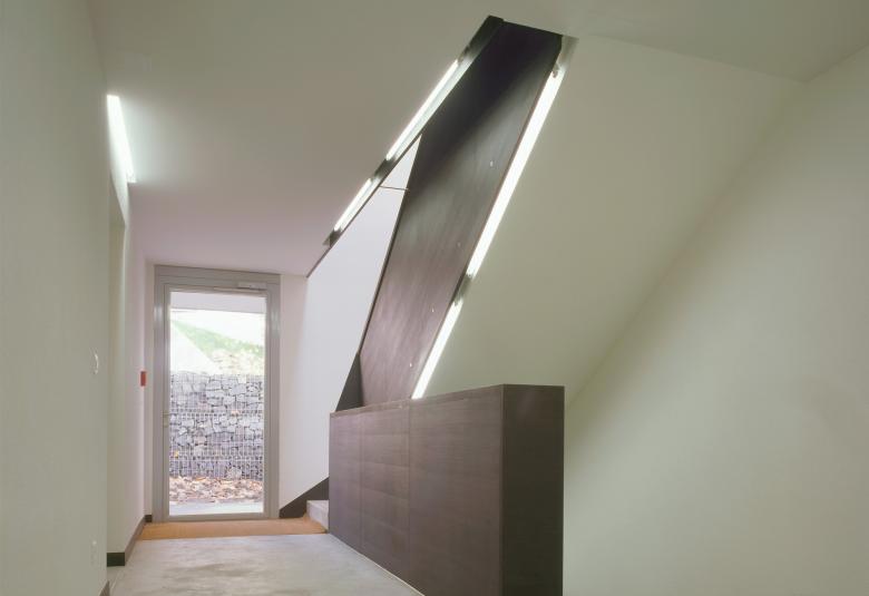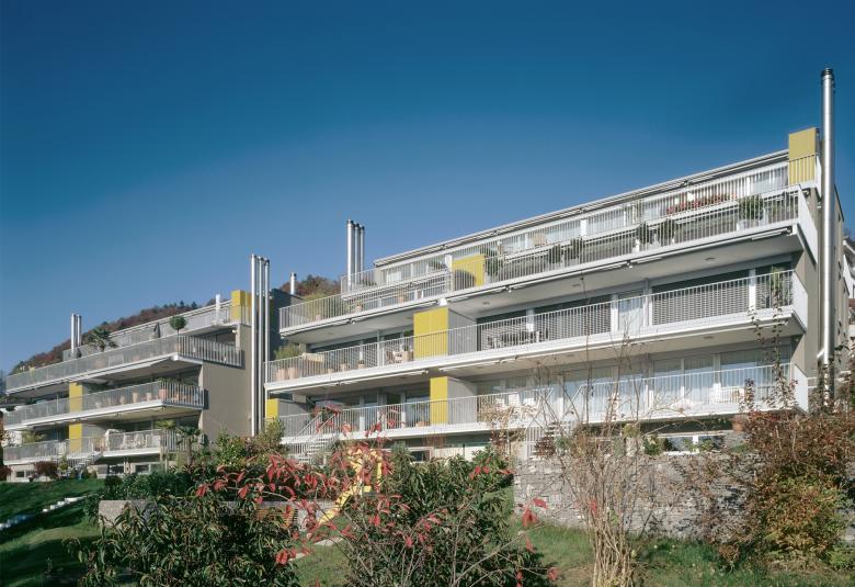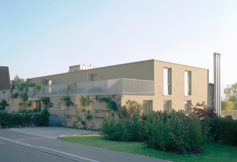 Das stark abfallende Grundstück liegt talseitig an der Glärnischstrasse im oberen Teil von Stäfa und hat eine gute Sicht auf den See und die Berge. Um das Grundstück maximal auszunützen, musste auch der untere Teil der Parzelle bebaut werden. Deshalb wurden zwei Volumen direkt an die Strasse und ein drittes frei im unteren Bereich angeordnet. Eine unterirdische, einspurige Rampe verbindet die drei Baukörper miteinander. In den Sockeln befindet sich die Sammelgarage. Darüber liegen die Wohngeschosse, die oben als Attika zurückversetzt sind. Charakteristisch sind die vielfältigen, flexiblen Wohnungsgrundrisse. Durch die lange, schmale Treppenhausform werden die Wohnungen optimal erschlossen. Die massiven Brüstungen säumen das natürlich belichtete Treppenauge von der Tiefgarage bis zur Attika. Jede Wohnung ist mit dem Lift direkt mit dem Untergeschoss verbunden. Die Frontfassade liegt hinter den durchlaufenden, grosszügig auskragenden Terrassen und sie erscheinen wie Decks. Durch die freie Fenstereinteilung an den Seiten- und Rückfassaden wirken die viergeschossigen Baukörper ungezwungen und jede Fassadenseite erscheint anders.