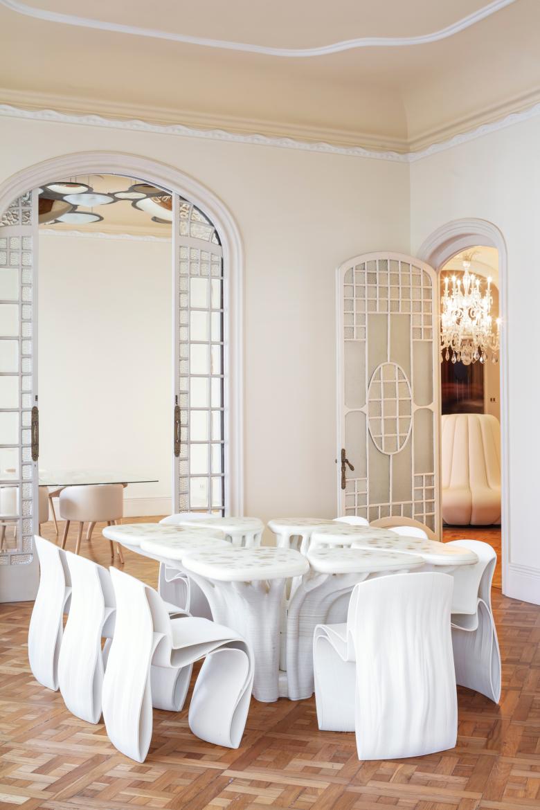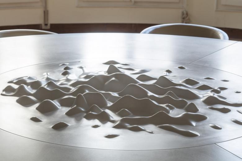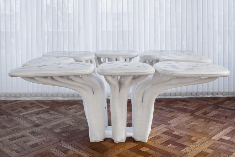 The materials for the production are innovative and surprising: for the Mangrove table and chairs the 3D printing of an advanced polymer is used and combined with a natural compound capable of mineralizing that absorbe the CO2 and make the furniture work like trees; the Spinal table is made by milling solid beech with 5-axis machines; The Milky table digitally translates the bacterial communities of raw milk, transforming them into an innovative white Corian cast table.