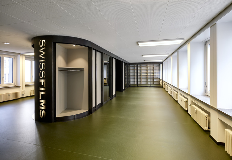 Der Raumkörper erinnert in seiner Form an einen Filmstreifen - eine Abwicklung aus aneinandergereihten Rahmenelementen mit unterschiedlichen Füllungen (tiefmatt bronzefarbene Metallplatten im Wechsel mit spiegelndtransparent verschiedenfarbigen Glasplatten) -, und reflektiert damit das Kernthema von SWISSFILMS - namentlich der Film als Geschäftsinhalt - in abstrahierter Form. Im Eingangsbereich werden Kastenwand mit Filmplakaten und Frontpartie des Raumkörpers mit hinterleuchteter Präsentationsnische und Firmenlogo, zum architektonischen Display und verweisen auf Inhalt und Bedeutung des Unternehmens.