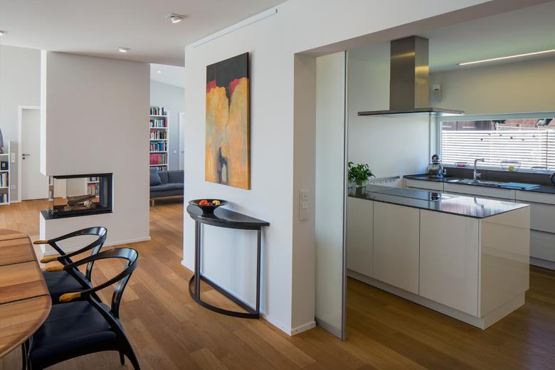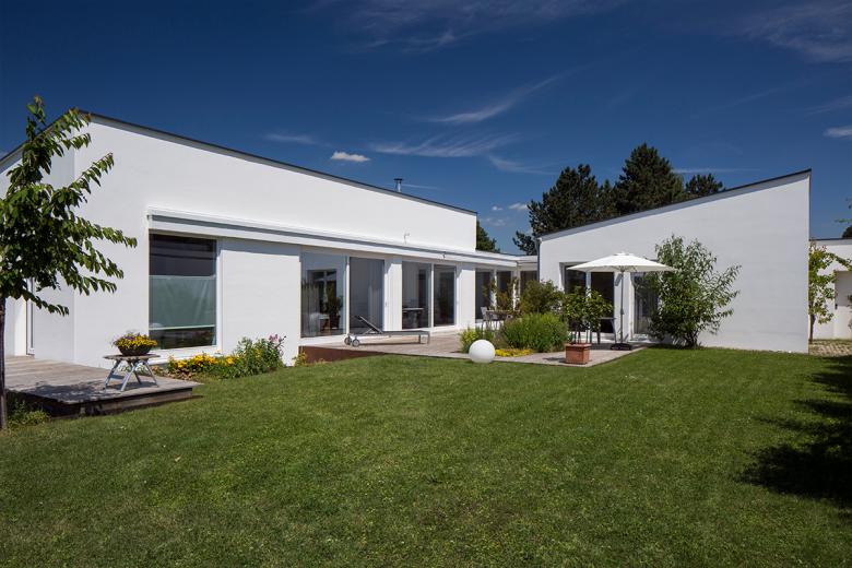 Im Hauptflügel befinden sich alle wesentlichen Räume. Zu Beginn noch sehr offen und fließend, sind die weiter hinten liegenden Räume abgegrenzt und von Privatsphäre geprägt. Auffallend sind die großflächigen Glasschiebeelemente auf der Südseite, während die Nordfassade sehr reduziert über kleine Fensteröffnungen verfügt. Im anderen Flügel sind der Kinderbereich und die Nebenräume untergebracht. Alle Räume sind barrierefrei.