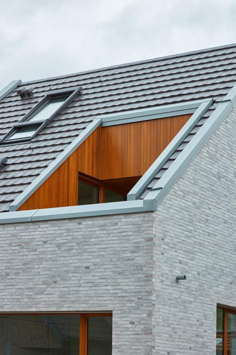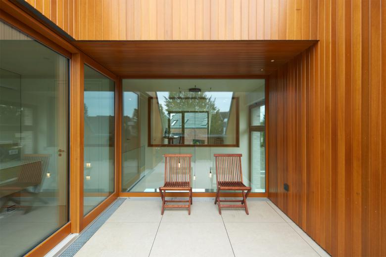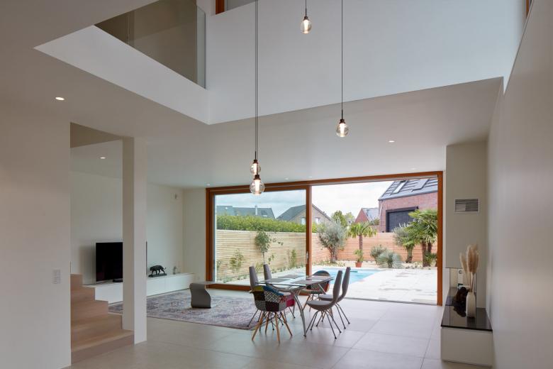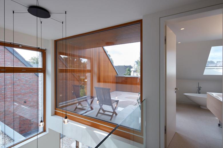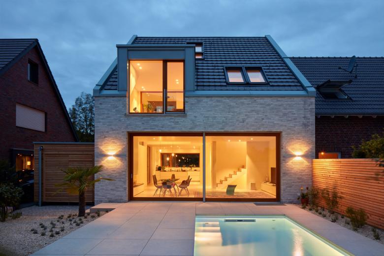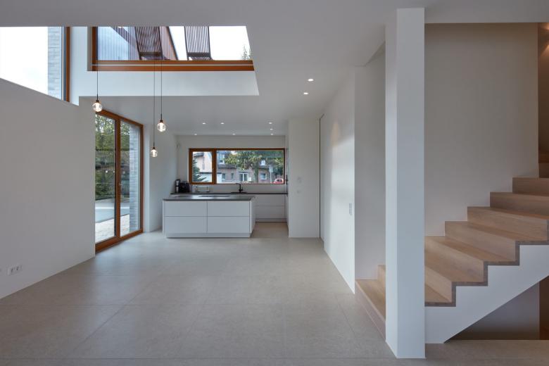 Geplant wurde ein Einfamilienhaus für ein junges Paar im Düsseldorfer Linksrheinischen, welches als Neubau an eine bereits bestehende Doppelhaushälfte angebaut werden sollte. Muss es sich Außen den strengen Restriktionen eines überalteten Bebauungsplanes unterwerfen, entsteht im Inneren ein über drei Geschosse reichendes Raumwunder. Durch eine zentrale Deckenöffnung im Erdgeschoss, sind sämtliche Räume optisch und auch physisch miteinander verbunden. Diese Maßnahme ist das entscheidende Raumelement, dass aus einer bescheidenen Ausgangssituation etwas Großes werden lässt.