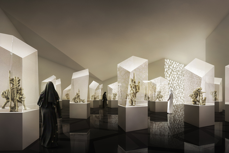 Das Herzstück des Gebäudes bildet die Ausstellungsfläche im ersten Obergeschoß. Sie stützt sich auf 5 Kerne, den 5 Säulen der islamischen Lehre (Shahada, Salat, Zakat, Saum und Hadsch). Die stützenfreien Ausstellungsräume sind in drei Routen organisiert, die die Geschichte der islamischen Kultur und des Koran wissenschaftlich und interaktiv vermitteln. Die hier inszenierte goldene Dachlandschaft sorgt für vielfältige Lichtstimmungen innerhalb der Ausstellungsräume, indem direktes, indirektes und gefiltertes Licht gezielt eingesetzt werden. Die Stimmungen werden durch sich wechselnde Raumhöhen unterstützt.