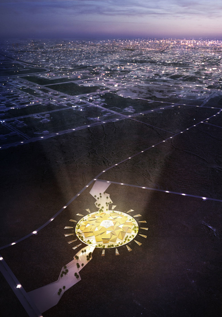 Die Form des Gebäudes leitet sich aus traditionellen islamischen Ornamenten ab. Simple geometrische Formen werden skulptural arrangiert und durch einen Ring zu einer Einheit zusammen gehalten.