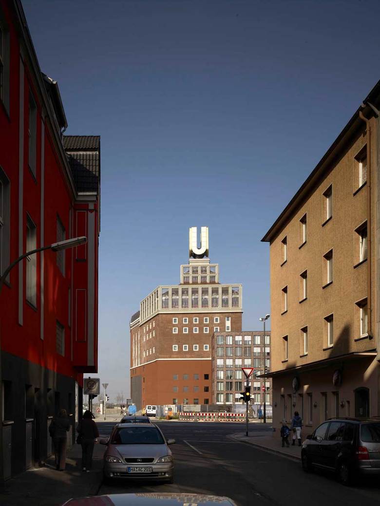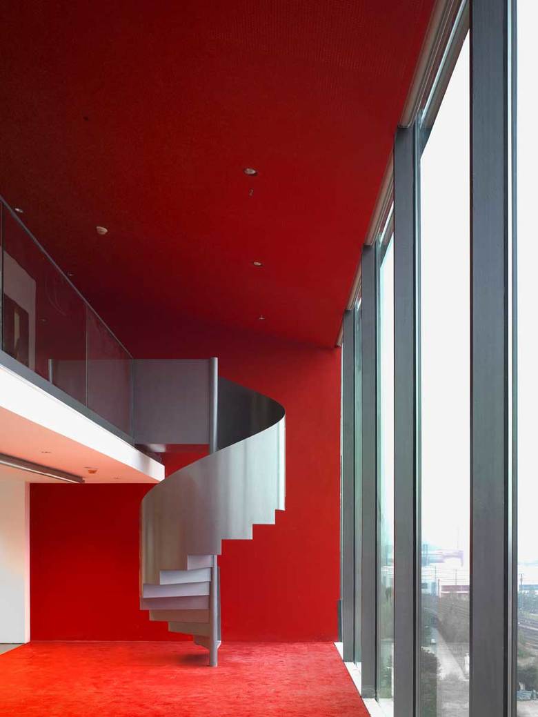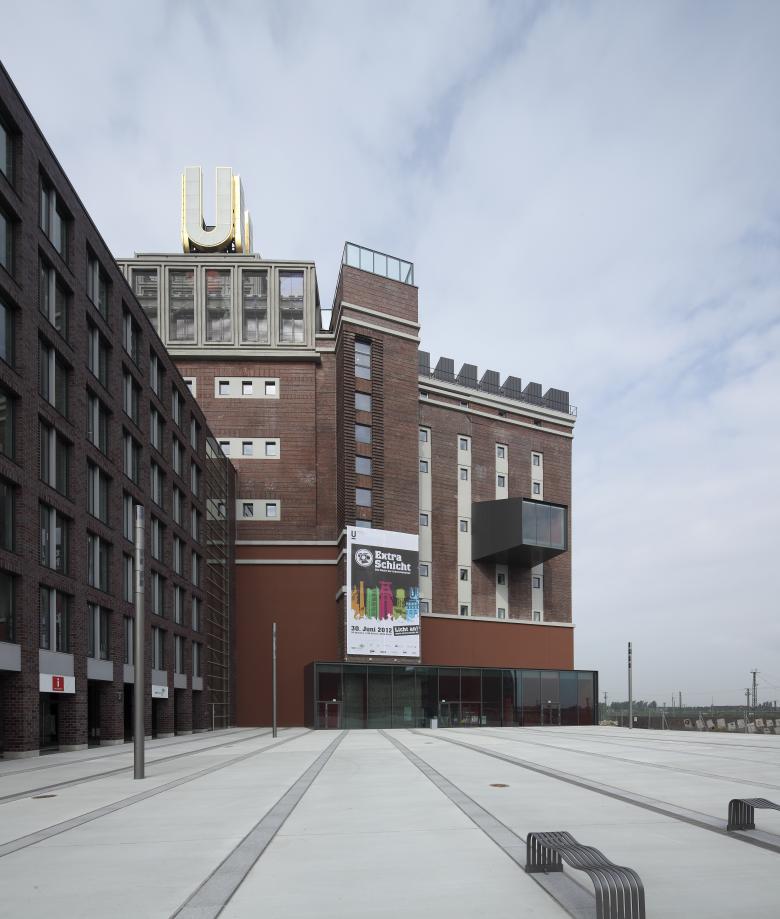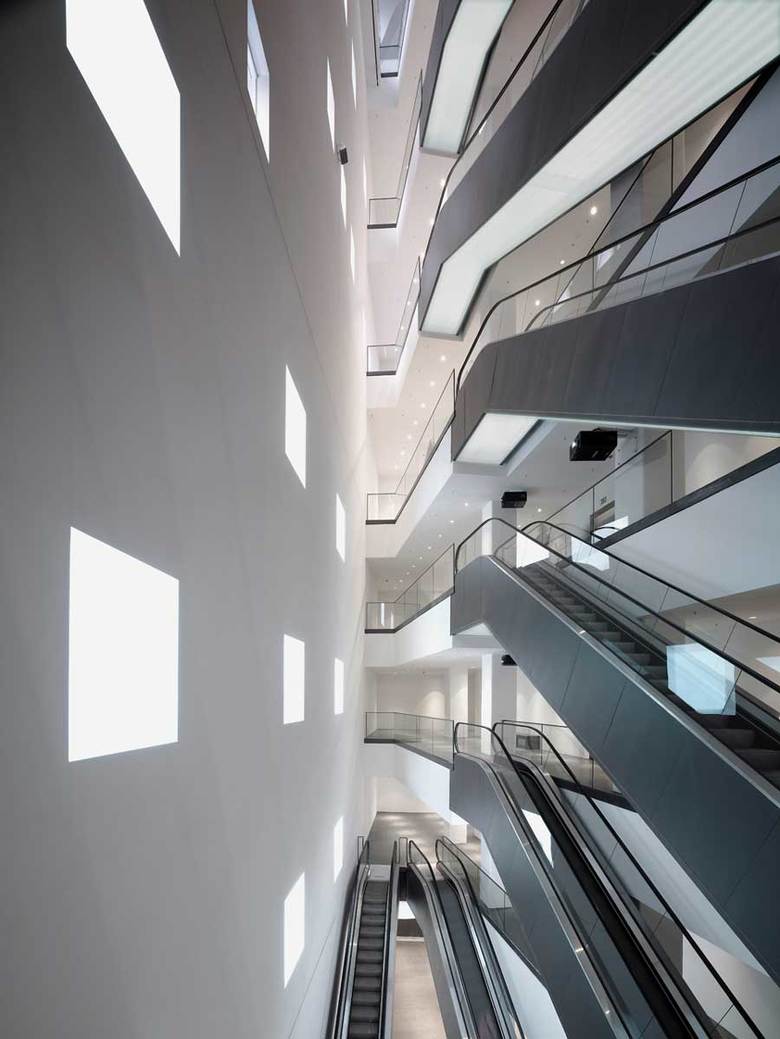 Mit der neuen „Vertikalen“, einem über alle Geschosse geöffneten Erschließungsraum zeigt sich das Bauvolumen des „U“ erstmals in seiner ganzen Größe auch im Innenraum. Rolltreppen führen vom Foyer im Erdgeschoss vorbei an allen Ausstellungsebenen bis hinauf in den „Kathedralenraum“ direkt unter dem leuchtenden U. Raumdurchdringungen von innen nach außen in Form konisch verzogener, metallverkleideter Kubaturen sind kontrapunktisch zu den vorhandenen roten Klinkerfassaden formuliert und verweisen auf die besondere Dachform des „Kathedralenraums“.