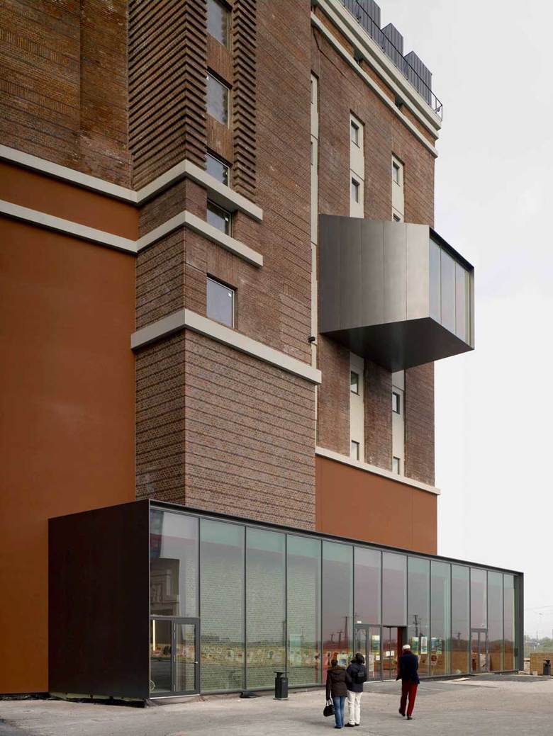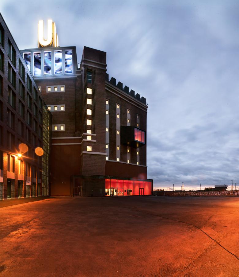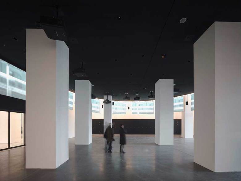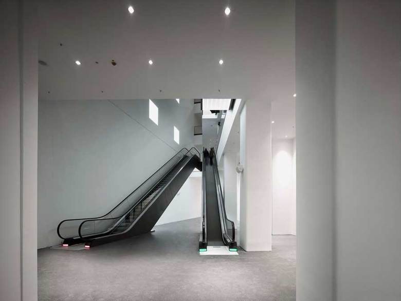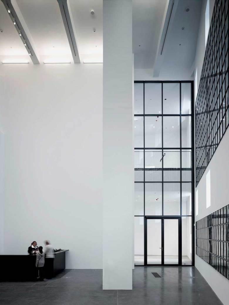 Mit der neuen „Vertikalen“, einem über alle Geschosse geöffneten Erschließungsraum zeigt sich das Bauvolumen des „U“ erstmals in seiner ganzen Größe auch im Innenraum. Rolltreppen führen vom Foyer im Erdgeschoss vorbei an allen Ausstellungsebenen bis hinauf in den „Kathedralenraum“ direkt unter dem leuchtenden U. Raumdurchdringungen von innen nach außen in Form konisch verzogener, metallverkleideter Kubaturen sind kontrapunktisch zu den vorhandenen roten Klinkerfassaden formuliert und verweisen auf die besondere Dachform des „Kathedralenraums“.