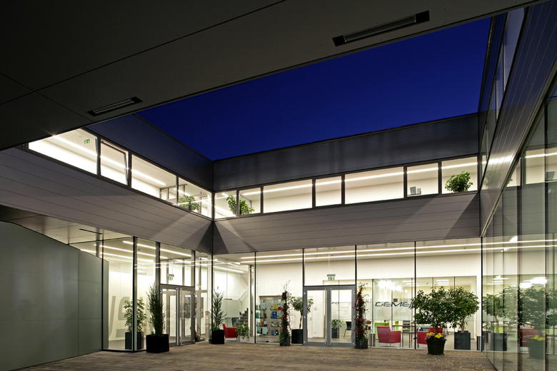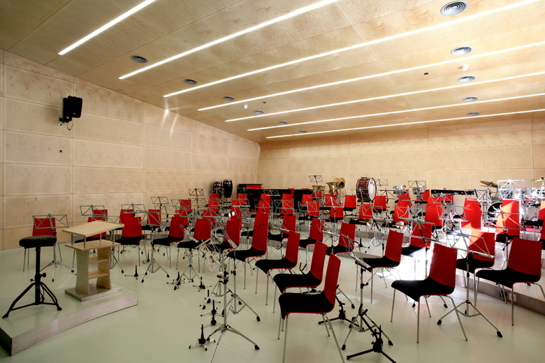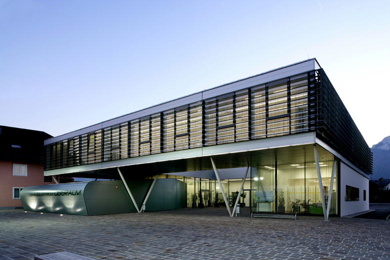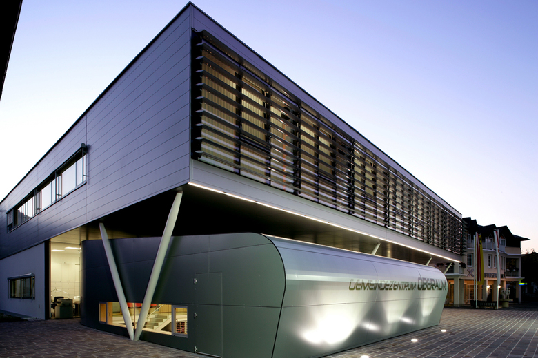Das Gemeindezentrum (hervorgegangen aus einem EU-weiten Wettbewerb) bildet mit dem Vorplatz der angrenzenden Bank einen neuen Dorfplatz. An der Form des Zentralbaus, an seiner klaren Strukturierung und Transparenz zeigen sich die Qualitäten dieser neuen Mitte. Der auskragende Musikprobensaal wirkt beweglich und leicht. Das Atrium bietet beste Bedingungen durch Bepflanzung und Querbelüftung und lässt auch eine Erweiterung in den Hof zu. Der Sitzungs- bzw. Trauungssaal schwebt auf zarten V-Stahlstützen und öffnet sich symbolhaft und demokratisch zum Dorf.