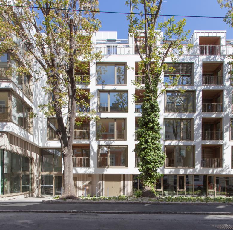 die Wohneinheiten bis hin zu den Dachgeschosswohnungen im sechsten Obergeschoss sukzessiv zurückgesetzt. Während hier überwiegend südlich gerichtete B-Wohnungen und nur wenige Nordwohnungen enthalten sind, befinden sich im hinteren Trakt zwei Geschosse mit ausschließlich durchgesteckten Wohnungen. Die Anordnung der Baukörper gestattet möglichst lichtdurchflutete Wohn- und Arbeitsräume. Jede der 56