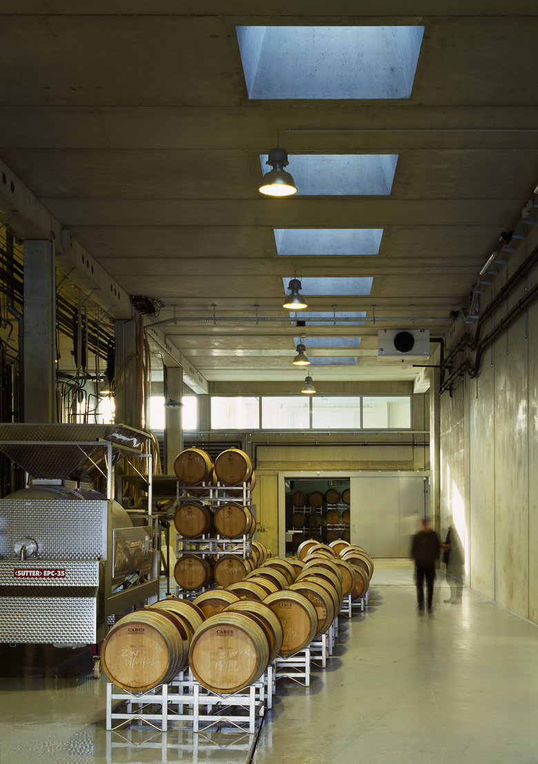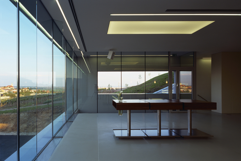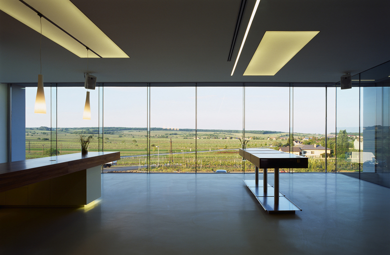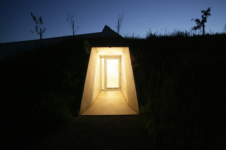 In Anlehnung an die Erdkeller der Kellergassen früherer Tage wurde bei dem Projekt der Vorteil des Erdklimas besonders genutzt. Der auskragende Teil mit der Präsentationslounge ist ein weithin sichtbares, sensibel gesetztes Zeichen, welches bei Nacht durch ein großes beleuchtetes Fenster in Erscheinung tritt. Lediglich die nach Norden ausgerichteten acht Pyramidenstümpfe über der großen Produktionshalle bringen natürliches Licht in die Arbeitsstätte. Letztendlich wurde die gesamte Halle wieder zugeschüttet und bepflanzt. Das Gras und die Weinstöcke schmiegen sich wie ein Mantel rund um den Bau.