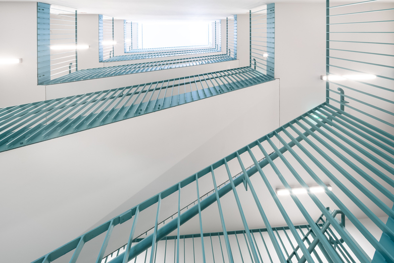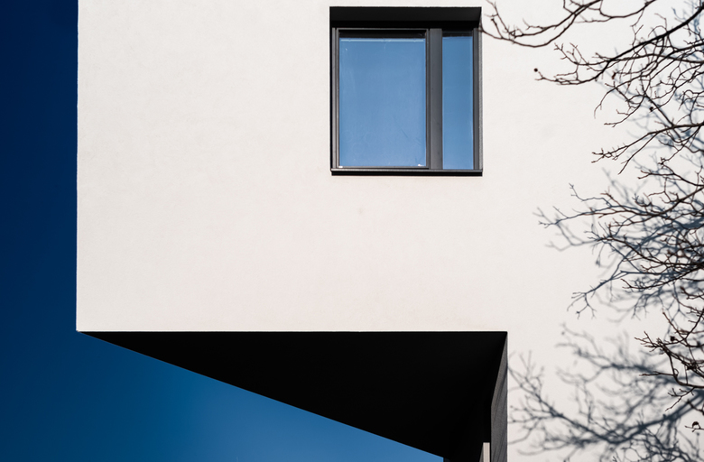 Die geschickte Ausnutzung der Bebauungsbestimmungen ergibt die vielfältige Differenzierung der Gesamtform. Die gezackte, abgestufte Dachkante und die teilweise zurückgesetzte und durch einen Materialwechsel betonte Sockelebene verleiht dem kompakten Volumen erstaunliche Leichtigkeit und verzahnt es mit der Umgebung. Die unregelmäßig angeordneten, feststehenden Fassadenelemente, die an Fensterläden erinnern, geben den Schauseiten zusätzlich Struktur. Trotz der Gesamtgröße ist immer das menschliche Maß der Bezugspunkt.