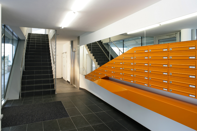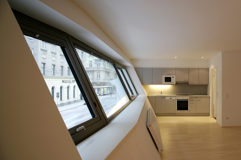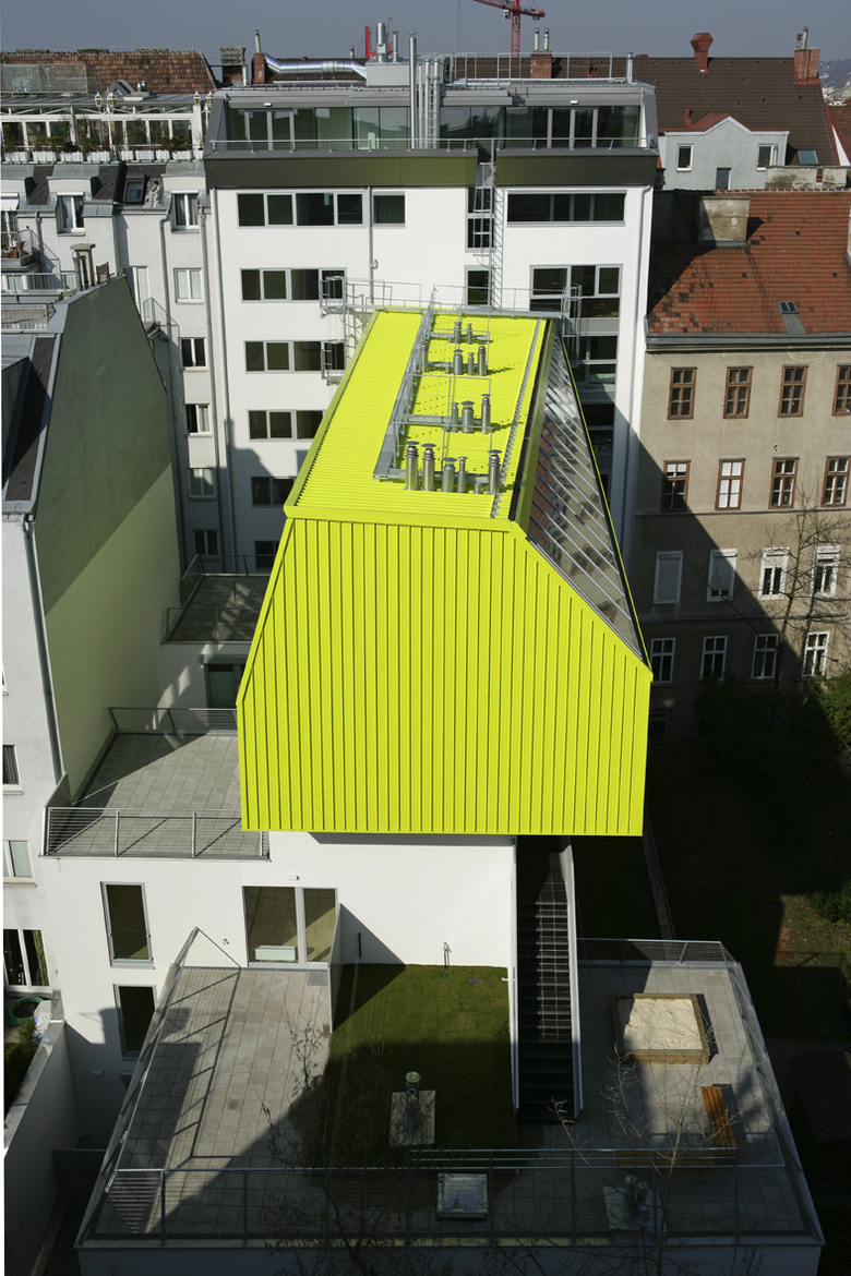 Der flexiblen Klientel bieten 47 individuelle, multimedial aufrüstbare Wohnungen mit vielfältigen Freiräumen auf ein oder zwei Ebenen den maßgeschneiderten Lebensrahmen. Jeder Haushöhenmeter weitet die Perspektive ins dichte Geflecht der Dachgärten, Terrassen, Balkone und Höfe, die als versteckte Oasen Neubau durchziehen. Lustvoll zelebriert der Riegel das Thema mit eingeschnittenen Atrien, Terrassen und offenen Laubengängen auf jeder Ebene anders.