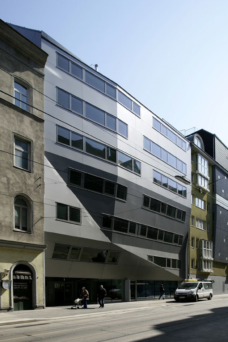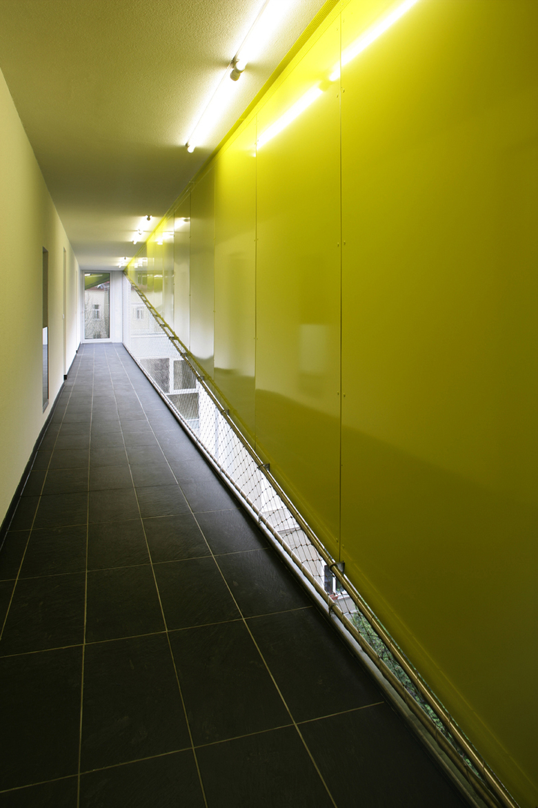 (…) man schrieb einen geladenen Wettbewerb zum Neubau aus, den gerner°gerner plus mit einer differenzierten Baukörperformation gewannen. Ein schmaler, vom rapsgelben Dach gekrönter Wohnriegel flankiert den grünen Hofweichteil, um sich straßenseitig mit knochenartig “dickem Ende” ins Mark der Stadt einzuklinken.