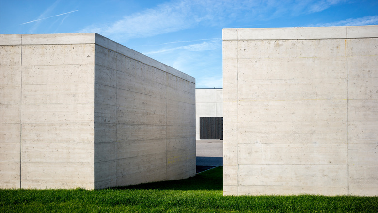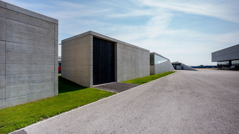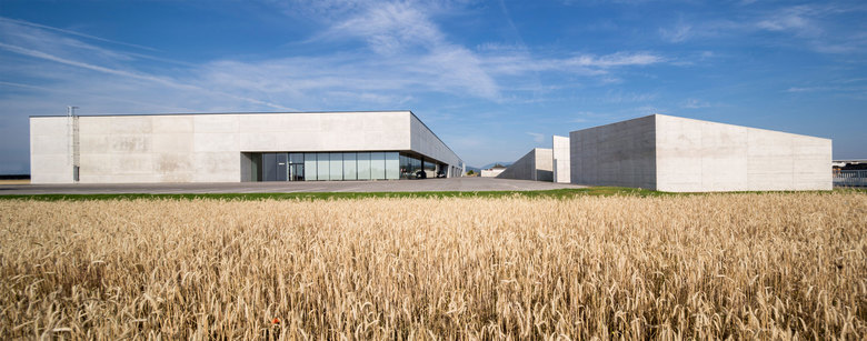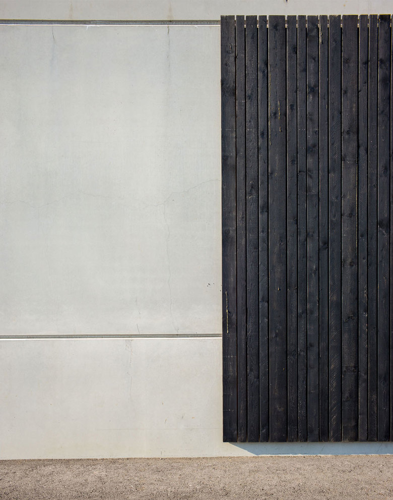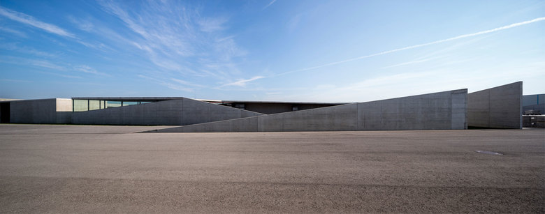 Auffällig ist der halboffene Lagerplatz. Einzig auf die Funktionalität entwickelt zeigt er sich als dynamische Sichtbeton-Skulptur, freistehend auf dem riesigen Gelände und mit einem über angeschrägten Oberlichten scheinbar schwebenden Dach.