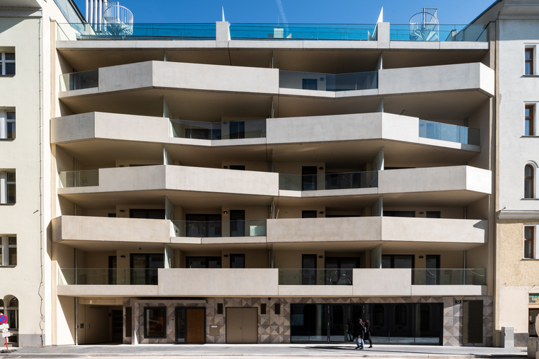In den Garten orientiert erweitern großzügige Freiflächen in Form von Terrassen im leichten Versatz die Wohnungen. On Top schließen große Dachterrassen das Volumen. Trotz größtmöglicher Flächenoptimierung entsteht ein Wohnbau, der durch zeitgemäße Zitate eine Referenz modernen Wohnens darstellt.