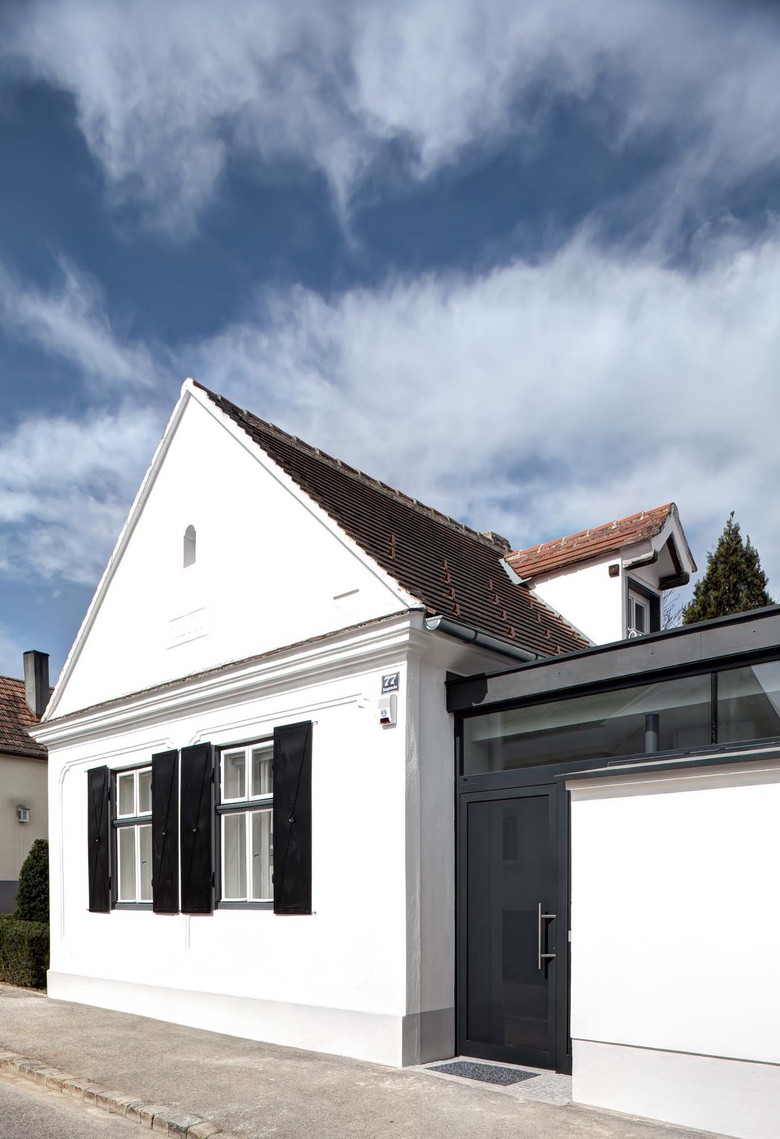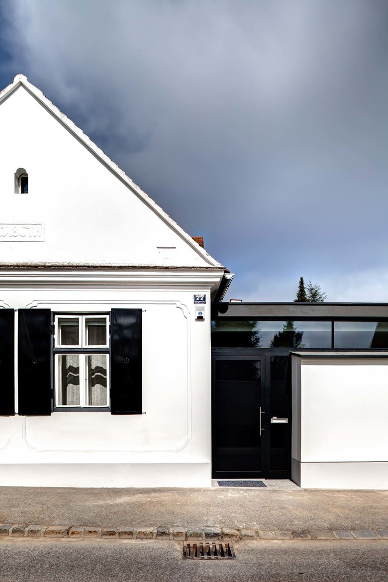 Neue Öffnungen im Mauerwerk werden als geradlinige Einschnitte gesetzt, und die Fassadengestaltung mit weißem Putz und schwarzen Fensterläden wird mit Haustür und Fenstereinfassungen in Schwarz fortgesetzt.