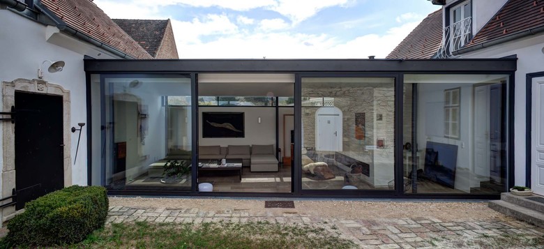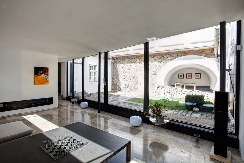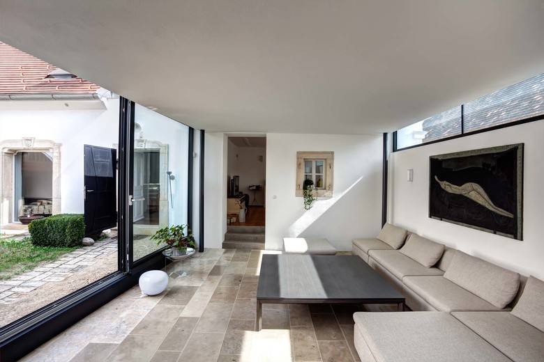 Der historische Bestandsbau wurde mit geringstmöglichen, aber ganz gezielten Eingriffen und Ergänzungen auf ein neues, zeitgemäßes Niveau des Wohnkomforts gehoben; der Innenhof zeigt sich jetzt als zusätzlicher hochwertiger Wohnraum im Freien.