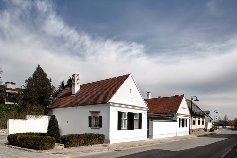 Das Eckgrundstück liegt an der Hauptstraße in geschlossener Bauweise, das Nachbarhaus rechts direkt angrenzend, während hinter der dicken Stützmauer am Innenhof das Gelände ansteigt und in lockere Bebauung und Felder übergeht. Die Fassadenansicht und die Gesamt-Dimension des Ensembles blieben nahezu unverändert, während die bestehende Mauer in den Hof hinein zu einem dreidimensionalen Baukörper erweitert wurde.