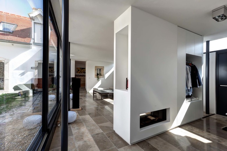 Die Materialwahl im Innenraum bleibt bewusst zurückhaltend. Der helle Natursteinboden mit Fußbodenheizung nimmt Bezug zum alten Steinpflaster im Innenhof, ansonsten schlicht weiße Wände, schwarze Stützen und Fensterrahmen – und ein beidseitig offener Kamin in der multifunktionalen Wand beim Eingang. Ergänzend wurden die angrenzenden Räume in den bestehenden Gebäudeteilen neu ausgestattet, etwa mit einer Kücheninsel, und der alte Holzdielenboden wurde mit aller Sorgfalt restauriert.