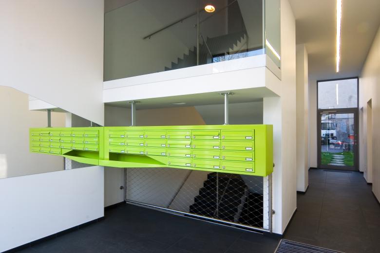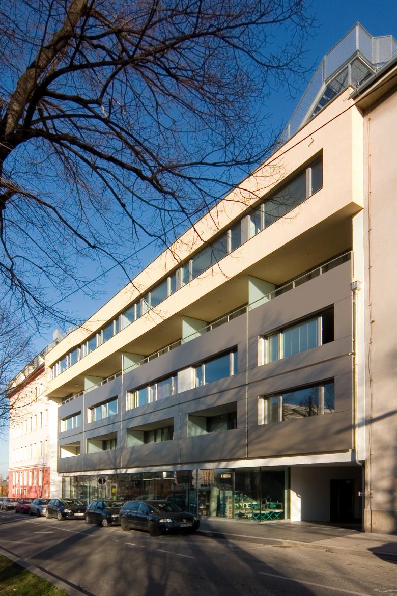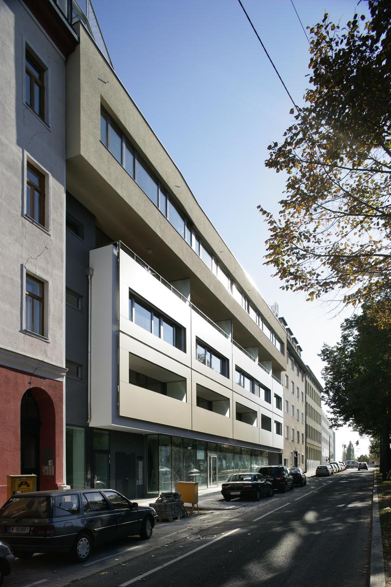 In den Geschoßen darüber setzen die zwanzig Wohnungen an. Wie in einer Schubladen-Kommode bleiben die einzelnen Wohneinheiten deutlich ablesbar. Wo die eine aufhört und die andere beginnt, bekommt die champagnerfarbene Alucobond-Fassade eine Fuge verpasst.