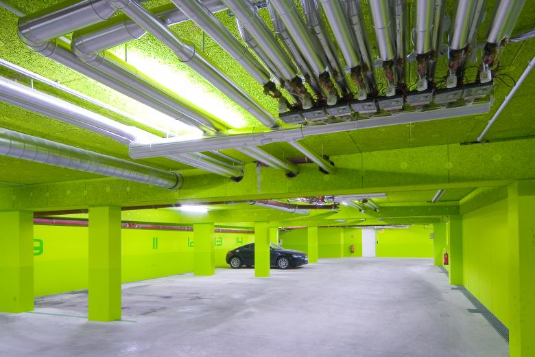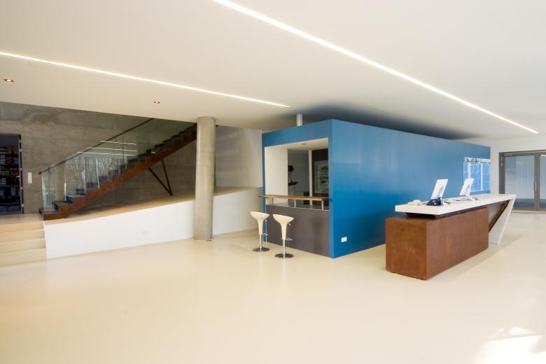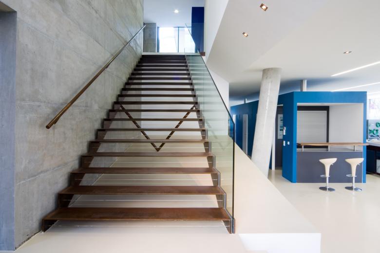 Das Erdgeschoß ist über die gesamte Länge verglast. Auserwählte Werkzeugbänke stehen wie freistehende Skulpturen in der Auslage. Im Innenraum finden sich ein heller Gussboden, geneigte Stahlbetonsstützen, voroxidierter Cortenstahl sowie ein corporategemäß blau gefärbtes Raummöbel mit Teeküche und Sanitärbereich.