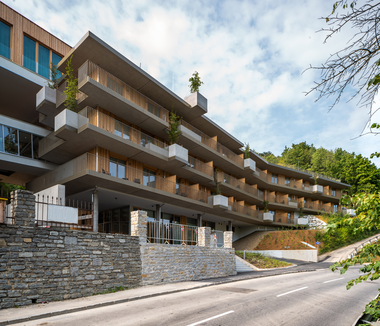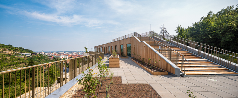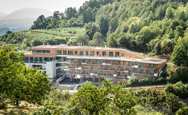 Der neue Gebäudeteil, Erweiterung um 32 Zimmer, des Hotel Steigenberger in Krems entwickelt die bestehende Form entlang der Hanglinien weiter bis sie sich behutsam mit dem Hang verwebt.
