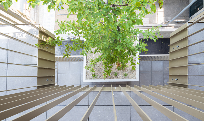 Das zurückgesetzte Erdgeschoss reagiert auf den bestehenden Wegeverlauf. Der von Norden herabsinkende Geländeeinschnitt (Waldweg) wird im Sockelgeschoss aufgenommen. Der Gebäudekörper wird in beiden Richtungen mit dem Bestand und der Landschaft verwoben.