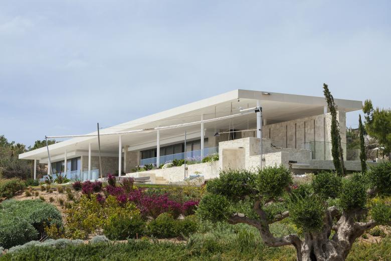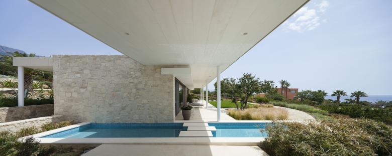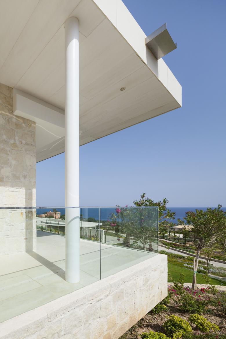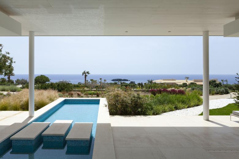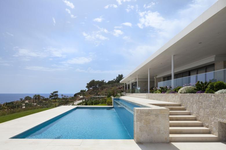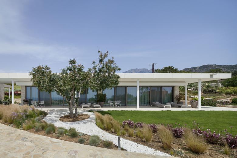 Das Gebäude selbst tritt durch ortstypische Steinverkleidung in den Hintergrund, gibt aber durch großzügige, raumhohe Verglasungen den Blick auf das Meer und den Garten frei.