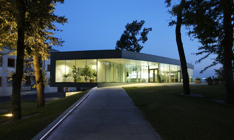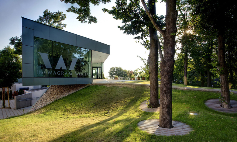 Die neue Gebietsvinothek in Kirchberg am Wagram umfasst auf zwei Ebenen rund 550 Quadratmeter Nutzfläche. Das Gebäude ist in Stahlbeton-Bauweise ausgeführt, im Bereich der Glasfassade kamen außerdem Stahlstützen zum Einsatz. Aufgrund der vielen unterirdischen Flächen erscheint das Haus von außen kleiner, als es ist. Durch die grünlich graue Faserzement-Fassade und die nachträgliche Modellierung der Topografie fügt sich das Bauwerk nahtlos in die Landschaft. Einzig und allein die Glasbox ragt als Landmark deutlich sichtbar zwischen den Bäumen hervor.